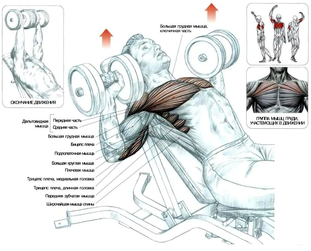 - Жим гантелей лежа под углом 45 градусов 15 х 4