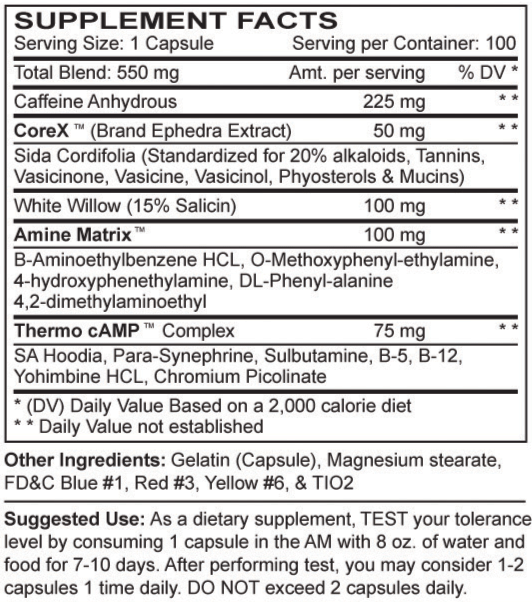 Еще один жиросжигатель под названием Diablos от американского производителя Innovative. На этот раз в основе стоит состав ЭКА (эфедра, кофеин, аспирин). Можно утверждать , что уклон данного комплекса расчитан на интенсивность тренировки. Дополнительно имеет термогенные свойства, увеличивает выносливость, концентрацию, и силовые показатели. Доступна фасовка 100 капсул.