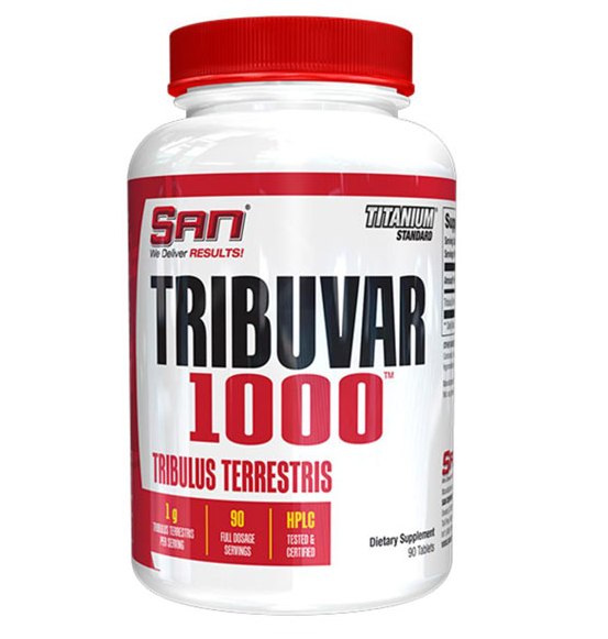 Високоякісний екстракт рослини Трибулус, для підвищення рівня тестостерону, у добавці SAN Tribuvar 1000, представленій популярним американським виробником спортивного харчування, компанією SAN Nutrition. Кожна порція Tribuvar містить аж 1000 мг трибулуса (45% сапонінів), який потрапляючи в організм, сприяє синтезу білка, підтримці позитивного азатистого балансу, скорочує час відновлення, підтримує рівень інсуліну, підвищує лібідо та синтез організмом власного гормону тестостерону. Доступні фасування: 90 та 180 капсул