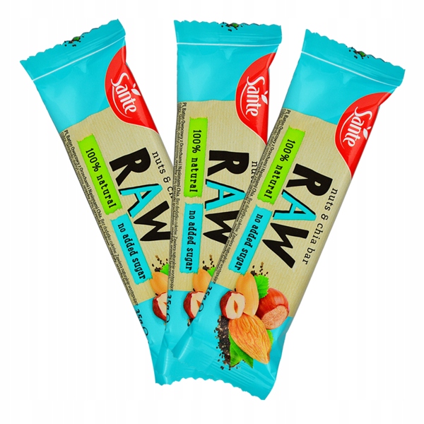 Батончики виробляють на основі смачної фінікової пасти з додаванням: горіхів, фруктів та насіння чиа. Батончики Sante RAW Fruit Bar без додавання цукру, вони містять ті цукру, які містяться в сухофруктах у складі даного печива. RAW батончики надають енергії і відмінно підходять для прийому перед тренуванням.