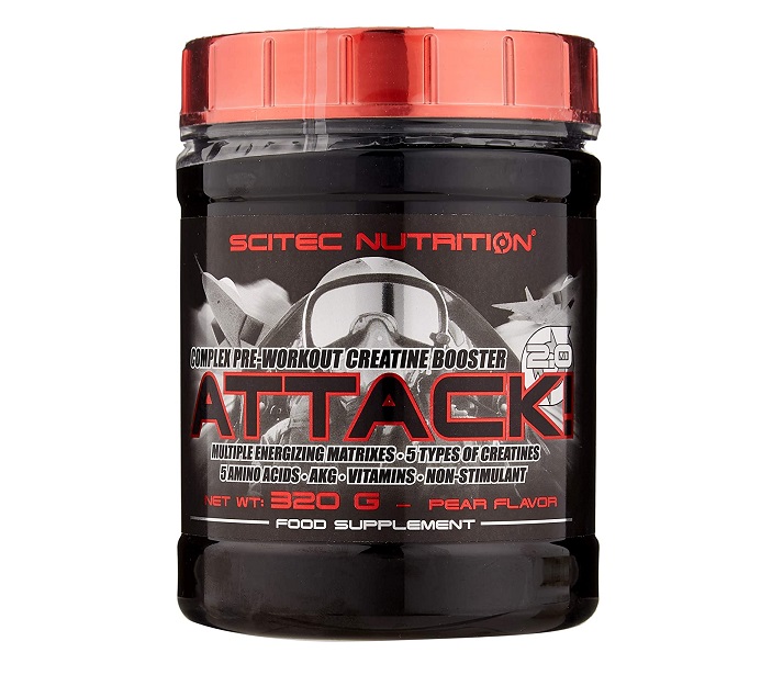 Перший передтренувальний комплекс без кофеїну від угорського виробника спортивного харчування Scitec Nutrition. Предтреник Attack 2.0 призначений для збільшення витривалості, стрибка силових показників завдяки 5 видам креатину у складі. Атак помітно підвищує рівень концентрації і наділяє вас потужним памп-ефектом. Доступна фасування: 32 та 72 порції (320 та 720 грам). Смак: вишня, грейпфрут.