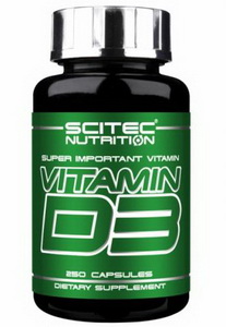 Вітамінна добавка від угорського виробника спортивного харчування Scitec Nutrition. Препарат Scitec Nutrition Vitamin D3, він же холекалциферол, головним чином, здатний регулювати кальціє-фосфорний обмін, допомагаючи завдяки цьому забезпечувати своєчасну і необхідну за кількістю подачу корисних речовин у кісткову тканину. Крім цього вітамін D3 здатний стимулювати організм на збільшення вироблення тестостерону, а також підтримувати м'язову активність. У продажу є фасування – 250 капсул.