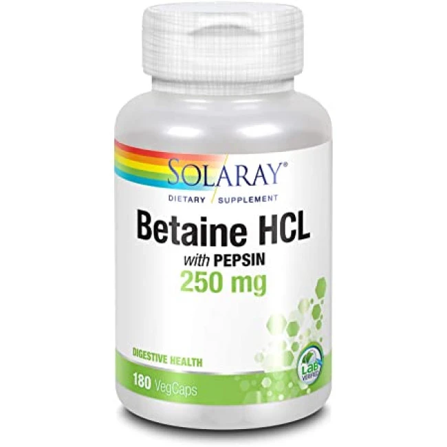 Бетаїн із пептином для зміцнення здоров'я, а також для прискорення травлення їжі. Також Solaray Betaine HCL with pepsin 250 mg приймають і для краси, він покращує стан волосся та нігтів, випускається у фасуванні 180 капсул. Основне завдання добавки - вироблення соляної кислоти для перетравлення білка.