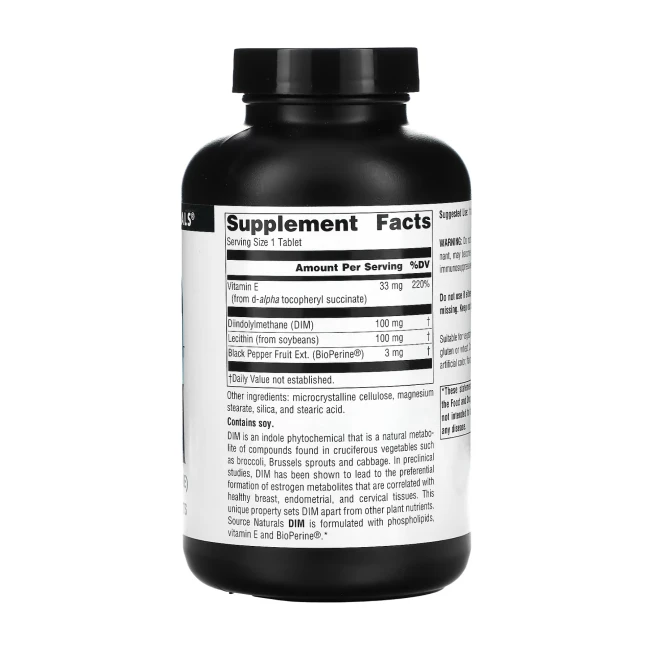 DIM – це фітохімічна речовина індолу, яка є природним метаболітом сполук, що містяться в хрестоцвітих овочах, таких як броколі, брюссельська капуста та капуста. У доклінічних дослідженнях було показано, що DIM призводить до переважного утворення метаболітів естрогену, які корелюють зі здоровими тканинами молочної залози, ендометрію та шийки матки. Ця унікальна властивість відрізняє DIM від інших рослинних поживних речовин. DIM від Source Naturals розроблений з фосфоліпідами, вітаміном Е та BioPerine ® .
