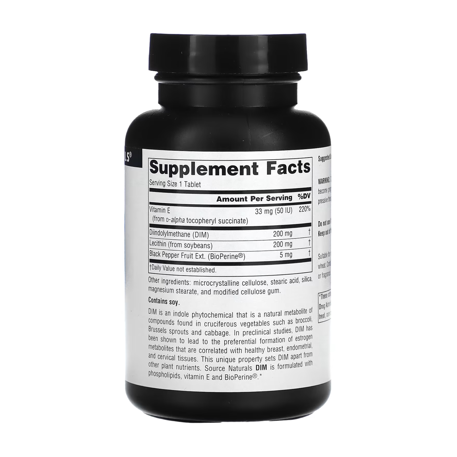 ДІМ— це фітохімічний індол, який є природним метаболітом сполук, що містяться в овочах сімейства хрестоцвітних, таких як броколі, брюссельська капуста та качанна капуста. Доклінічні дослідження показали, що ДІМ сприяє утворенню метаболітів естрогену, які допомагають підтримувати здоров'я тканин молочних залоз, внутрішньоматкових і цервікальних тканин. Ця унікальна властивість відрізняє ДІМ від інших поживних рослинних речовин. ДІМ від Source Naturals містить фосфоліпіди, вітамін Е та BioPerine®.