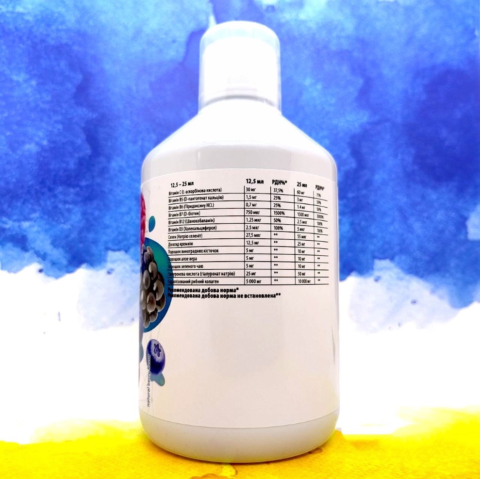 - Здоров'я шкіри підтримує колаген, селен, алое віра, екстракт виноградної кісточки, зелений чай та вітаміни.