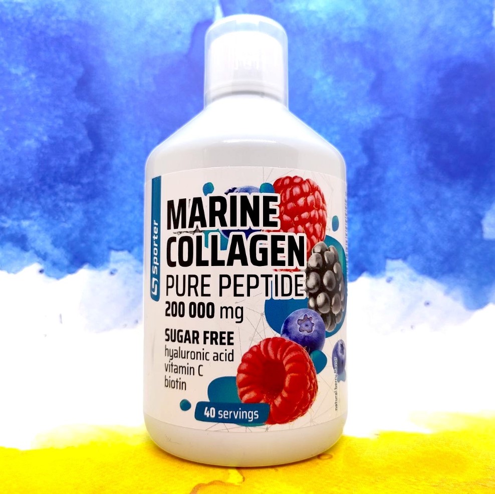 Рибний колаген 1 та 3 типу у формі пептидів з додаванням гіалуронки, алое, зеленого чаю, виноградних кісточок та вітамін С, Д та Б. Sporter Marine Collagen відмінний варіант для тих хоче зміцнити здоров'я суглобів, волосся, нігтів та шкіри. Упаковка на 500 мл містить аж 200 000 мг колагену на повноцінних 40 днів прийому.