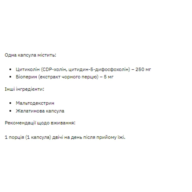 | Choline (холін, вітамін Б4) | 250 мг цитиколін (CDP-холін, цитидин-5-дифосфохолін) |