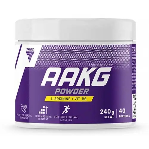 Харчова добавка у формі порошку, що містить L-аргінін та вітамін B6 збільшує вироблення оксиду азоту, що підтримує регенеративні процеси, підвищує ефективність тренувань та позитивно впливає на серцево-судинну систему. Trec Nutrition AAKG Powder збагачений вітаміном В6, який впливає на підтримку правильного метаболізму білків та глікогену, а також допомагає знизити втому та стомлюваність під час тренувань.