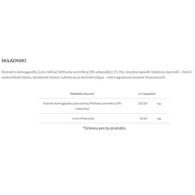 | Ashwagandha (ашвагандха) | 335 мг (extract whole plant) (Whitania somnifera) (9% withanolides), of which withanolides 30 мг |