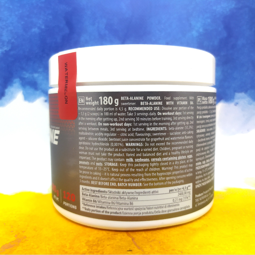 Завдяки бета-аланіну підвищується рівень карнозину, що відповідає за нейтралізацію кислотності м'язів – він бореться з болем та підвищує їхню витривалість. Trec Nutrition Beta Alanine допоможе збільшити аеробні можливості організму і зробить ваші тренування тривалішими та інтенсивнішими. Бета-аланін допомагає інтенсивніше нарощувати м'язову масу. Додавання вітаміну B6 підвищує ефективність порошку бета-аланіну, регулюючи енергетичний обмін в організмі.