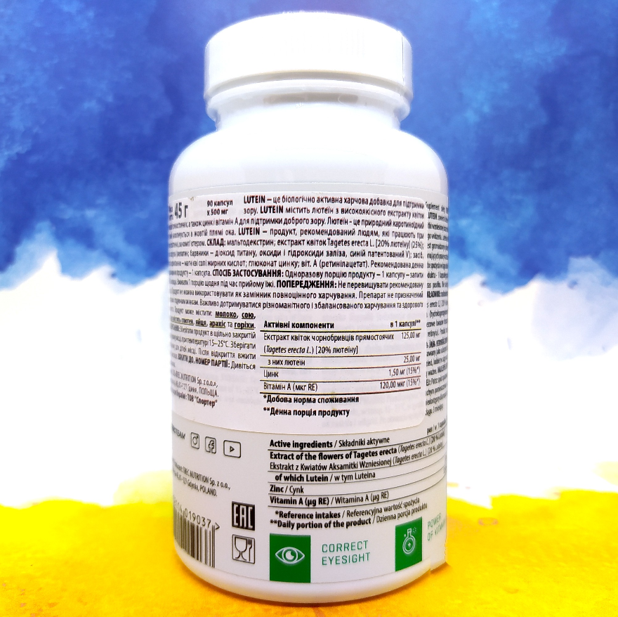 | Lutein (лютеїн) | 125 мг екстракт квітки Tagetes erecta (містить 20% лютеїну = 25 мг) |