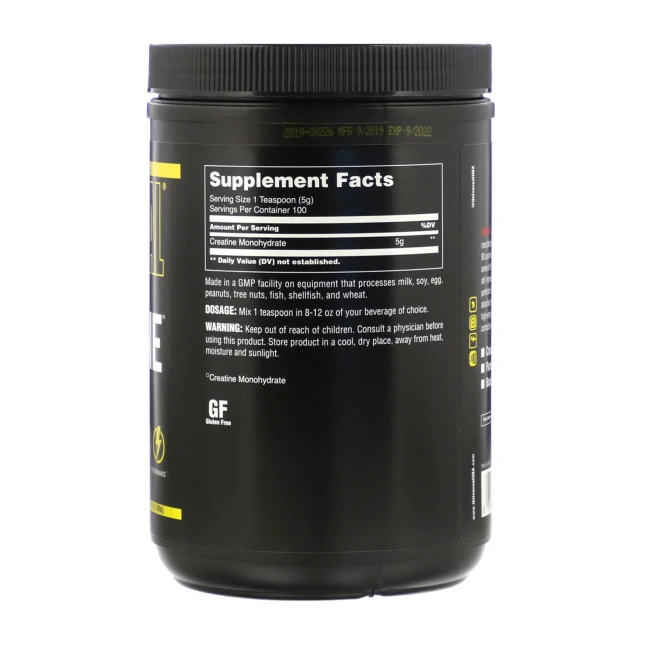 Цілком стандартний чистий моногідрат креатину від легендарної американської компанії виробника спортивного харчування преміум класу, Universal Nutrition. Сировина цього креатину запатентована і виробляється в Німеччині під назвою Creapure. Дана спортивна добавка покликана підвищити силові показники спортсмена, збільшити витривалість та м'язову масу.