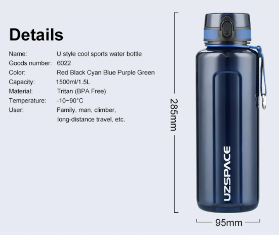 Большая и качественная бутылка для воды и напитков на 1,5 литра в чёрном и синем цветах. UZspace waterbottle U-type 6022 имеет закрытое горлышко, чтобы грязь и пыль не попадали на неё, открывается с помощью откидной крышки на кнопке, с фиксатором от случайного открытия. В данной бутылке Вы сможете приготовить 1500 мл любимых аминокислот, изотоника или другого любимого напитка для тренировки, или для похода.