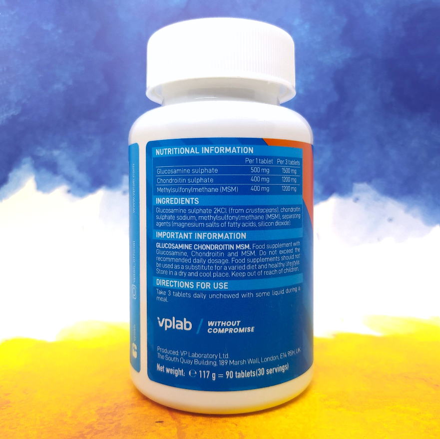 Прийняття добавки VP Lab Glucosamine Chondroitin MSM зменшує ризик виникнення захворювань суглобів, бере участь у регенерації сполучних тканин, збільшує пружність зв'язувань та допомагає відновлюватися після тренування та травм. Продукт чудово підходить фізично активним людям.