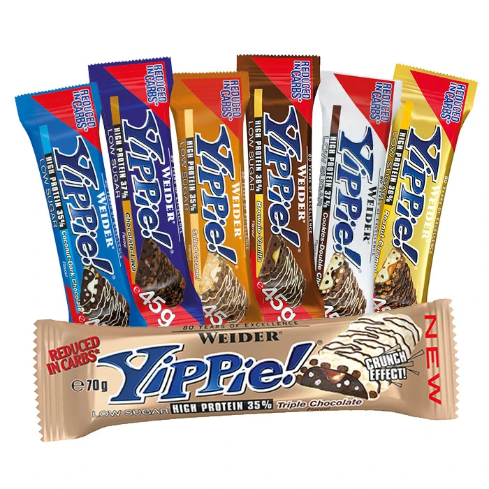 Протеиновые батончики от известного немецкого производителя спортивного питания, компании Weider. Weider yippie содержит 36% высококачественного белка, и примерно столько же углеводов. Рекомендовано употреблять батончики weider в качестве питательного перекуса, как перед интенсивной тренировкой, так и после нее, а также в промежутках между основными приемами пищи. Доступная фасовка: 18 батончиков по 45 грамм. Вкус: черный шоколад-кокос.